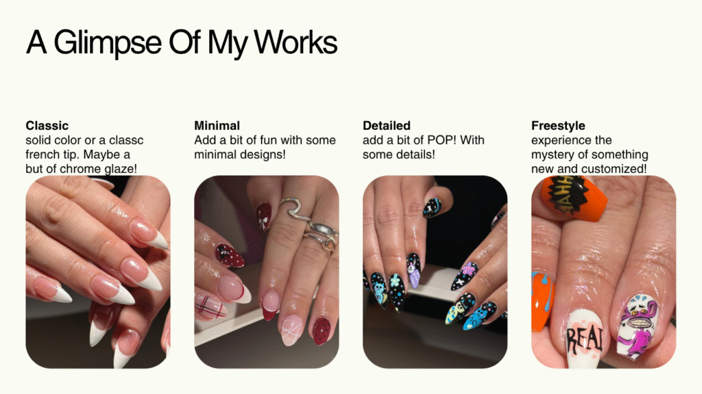 She takes her time and files the nails so beautifully! she is an incredible artist and can do any design you want!