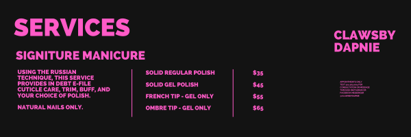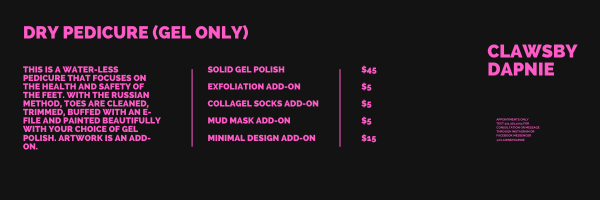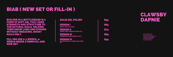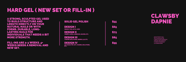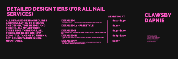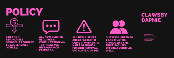 There was an error trying to submit your form. Please try again. Fill in your first and last name: * This field is required. i confirm that i have read, understand, and agree to follow all salon policies including booking, deposits, cancellations, and service expectation. * This field is required. I understand that the nail technician reserves the right to refuse or discontinue service at any time for safety, health concerns, inappropriate behavior, or policy violations. * This field is required. I understand that failure to cancel or reschedule without notice will result in my card on file being charged the full scheduled service amount. * This field is required. do you have diabetes? * yes no This field is required. Do currently you have any of the following on hands or feet? * open wounds fungus/infection warts allergies to nail products recent injury or surgery none This field is required. I understand that certain medical or nail condition may require modification or refusal of service for safety resons. * This field is required. I give permission for photos/videos of my nails to be used for portfolio or marketing purposes. * This field is required. what is your preferred appointment environment? quiet / minimal converstation light conversation i love to yap! Would you like entertainment during your appointment? * watch a show/movie listen to music no preference This field is required. If yes, preferred genre: This field is required. Submit There was an error trying to submit your form. Please try again.