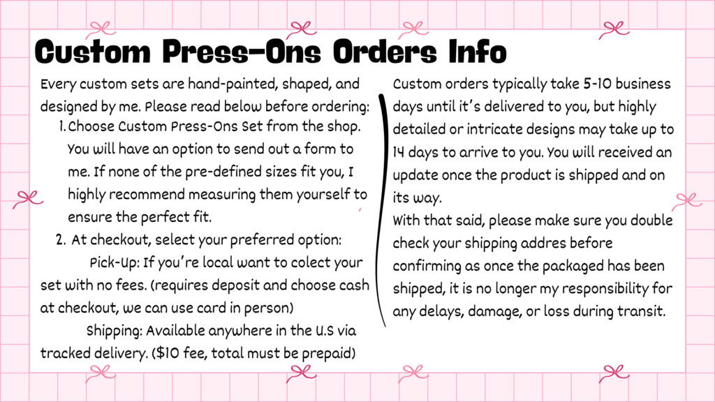 Select options Custom Press-Ons Custom Press-OnsRated 0 out of 5 $30.00 – $75.00Price range: $30.00 through $75.00 Choose an optionXSSMLXLXSSMLXL Choose an optionSMLXLSMLXLClear